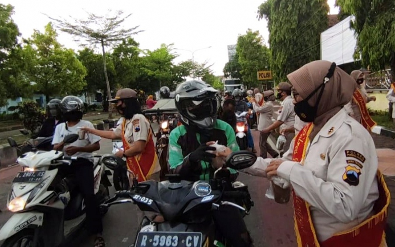 Pegawai Negeri Sipil (PNS) di lingkungan Polres Purbalingga menggelar pembagian takjil untuk pengguna jalan. Kegiatan dilaksanakan di simpang empat patung Jenderal Soedirman Purbalingga, Jumat (30/4/2021) sore.