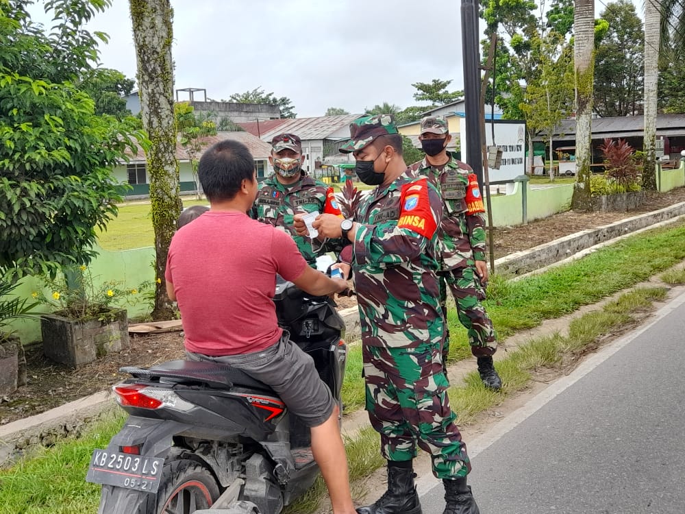 Landak – Koramil 1201-11/Ngabang rutin melaksanakan protokol tetap (Protap) kesehatan kepada masyarakat di depan Makoramil Ngabang, Jalan Pemuda, Minggu (23/5/2021).