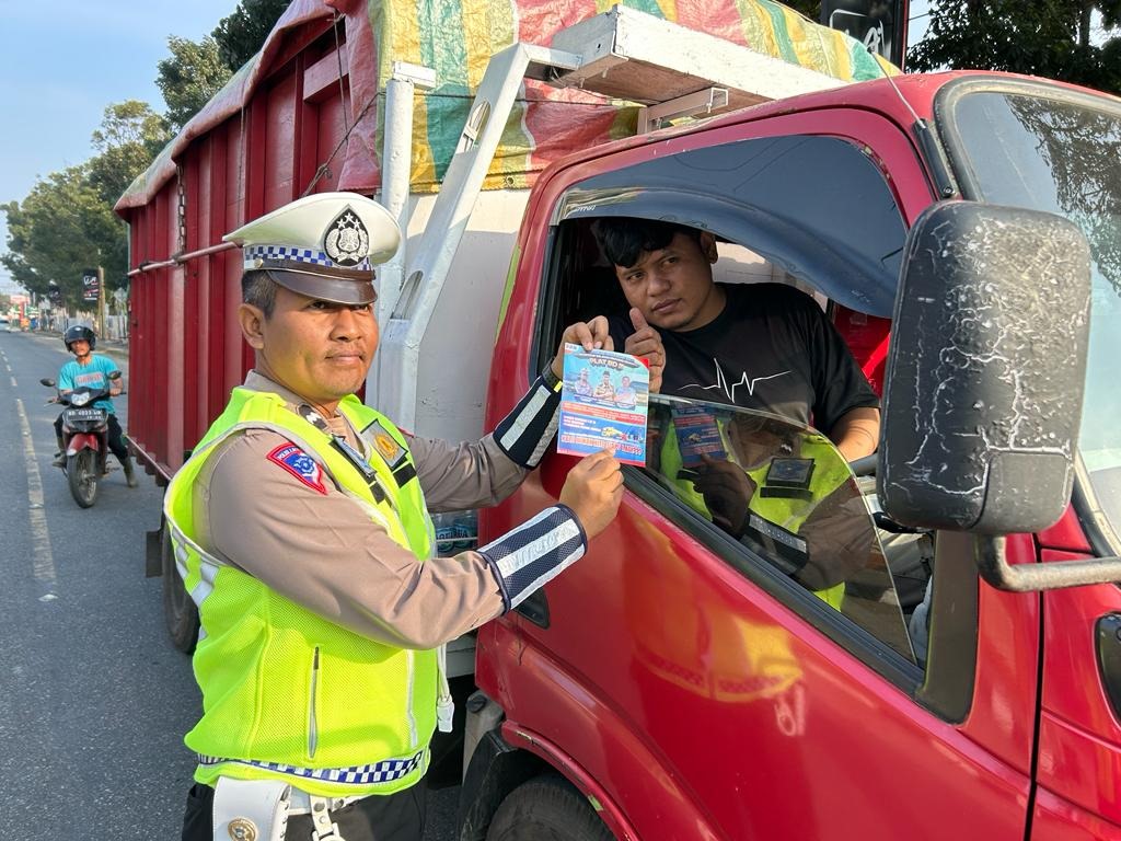 Pembagian stiker dan pemasangan stiker dilakukan personel kepada para pengemudi dan kendaraannya yang melintas dihari itu.
