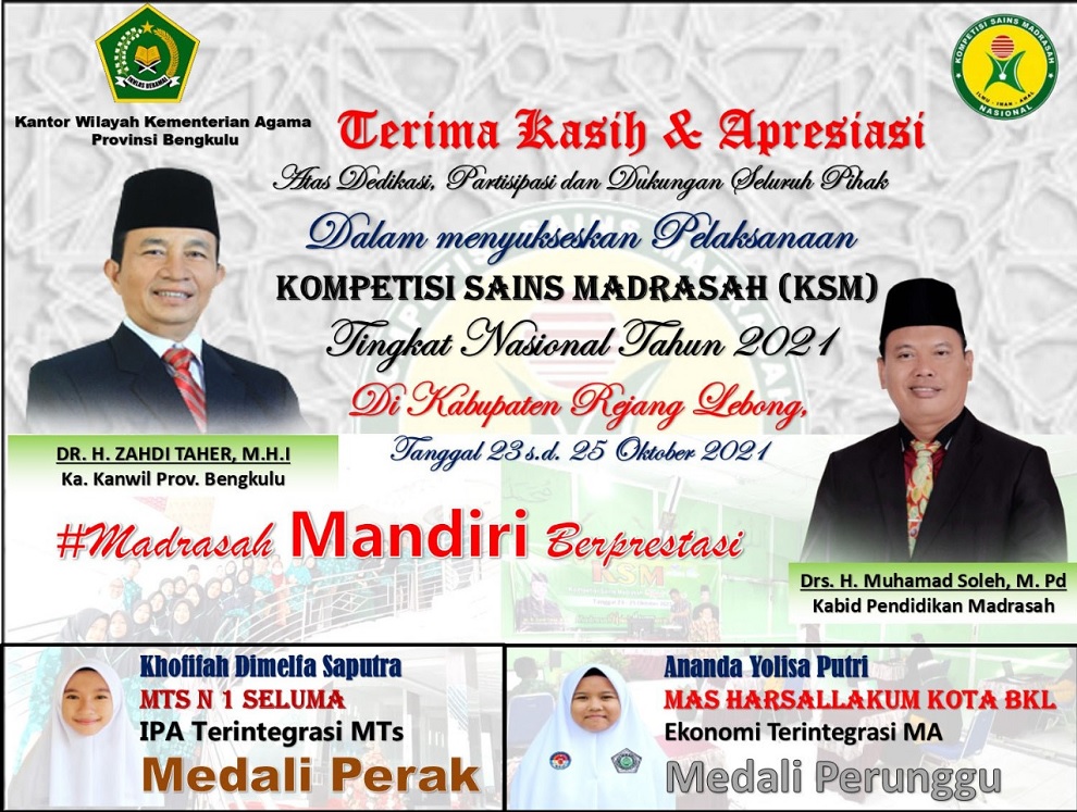 Bengkulu, Siberindo.co – Dua siswi terbaik Madrasah dari Provinsi Bengkulu sukses meraih dua medali dalam ajang Kompetisi Sains Madrasah (KSM) 2021 Kementerian Agama. Kedua siswi berhasil membawa pulang medali perak dan medali perunggu.