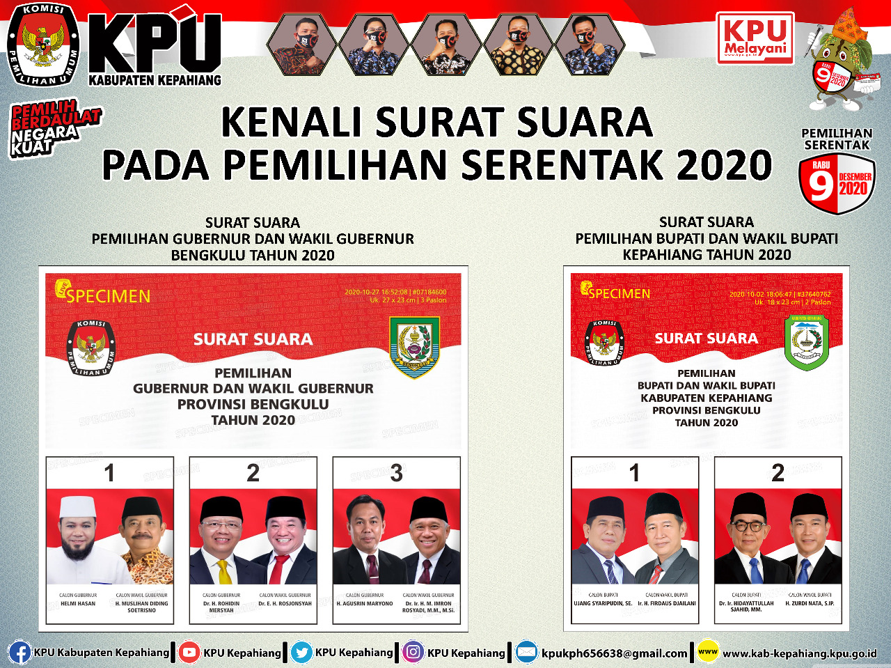 “KPU Kepahiang sudah mengumumkan agar masyarakat mengenali surat suara pada pemilihan serentak 2020 ini, termasuk tata cara pencoblosan sah atau tidaknya,” sampai Komisioner Divisi Sosialisasi KPU Kepahiang Supran Efendi, S.Sos.i.