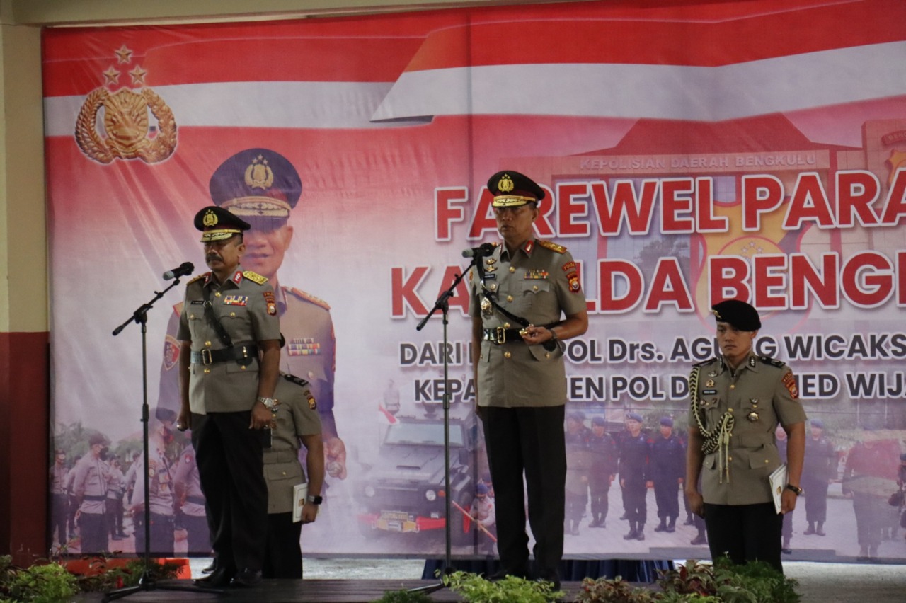 Dalam Upacara farewell parade yang digelar di parkiran Aula Adem Mapolda Bengkulu tersebut Irjen Pol Drs. Agung Wicaksono menyerahkan bendera pataka kepada Kapolda Bengkulu yang baru.