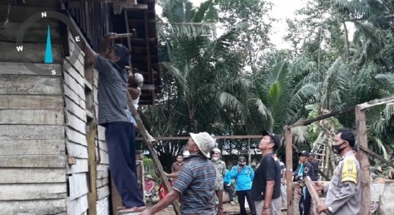 SUNGAI RUMBAI – Polsek Sungai Rumbai mengerahkan personel membantu warga yang kediamannya roboh tertimpa pohon. Personel bersama-sama warga, memperbaiki rumah milik Supardi (52), warga Desa Talang Gading Kecamatan Sungai Rumbai Kabupaten Mukomuko, sekitar pukul 09.00 WIB hari ini.