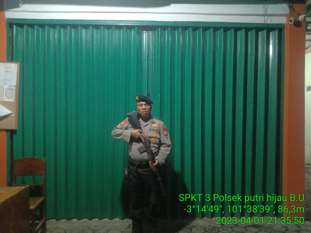 Bengkulu Utara — Anggota Polsek Putri Hijau, Polres Bengkulu Utara Polda Bengkulu melaksanakan pengamanan obyek vital yang ditugaskan untuk melaksanakan pengamanan di Kantor Bank BPD Capem Putri Hijau Sabtu Malam, (01/04/2023).