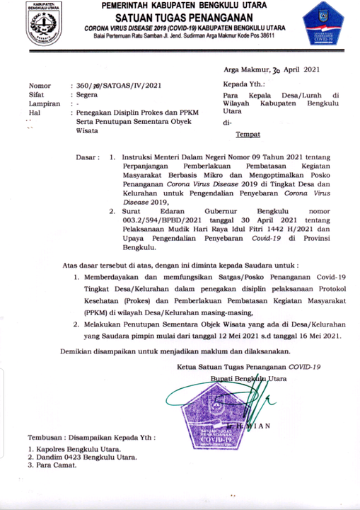Mengingat kasus Covid-19 di Kabupaten Bengkulu Utara yang mengalami peningkatan, Bupati berharap seluruh pihak dapat terlibat aktif, bersinergi, dan berkolaborasi dalam pelaksanaan PPKM pada tingkat Desa dan Kelurahan.