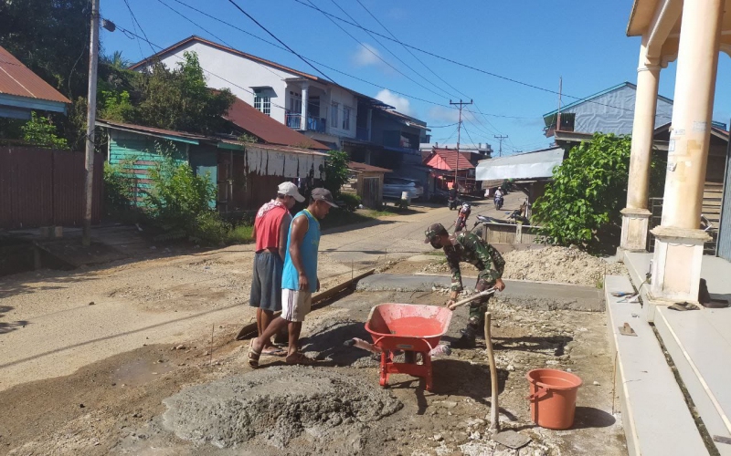 Babinsa Koramil 1206 -02/Semitau, Serka Rochmat, membantu warga memperbaiki jalan rusak di Desa Semitau Hulu.