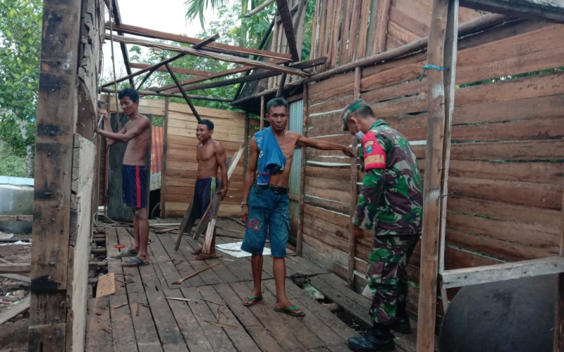 Babinsa Koramil 02/Sungai Pinyuh, Koptu Ma’mun bersama masyarakat kembali merenovasi rumah tidak layak huni milik Tukiyeh (63), warga Desa Galang, Kecamatan Sungai Pinyuh, Kabupaten Mempawah, Minggu (30/5/2021).