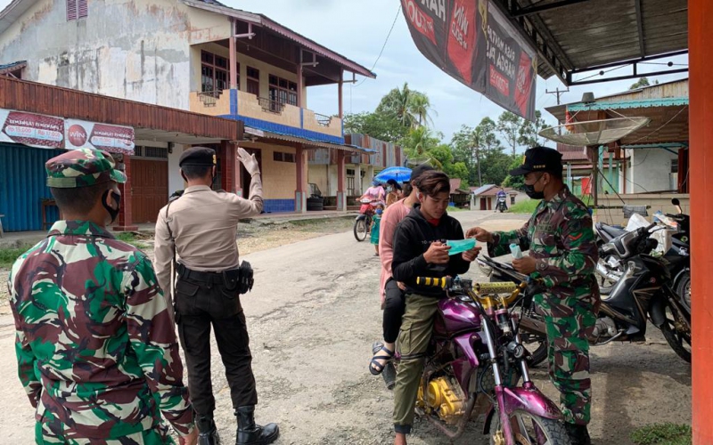 Babinsa Koramil 1201-05/Toho, Serma Jumro membagikan masker secara gratis kepada masyarakat di Desa Sepang, Kecamatan Toho, Kabupaten Mempawah, Minggu (30/5/2021).
