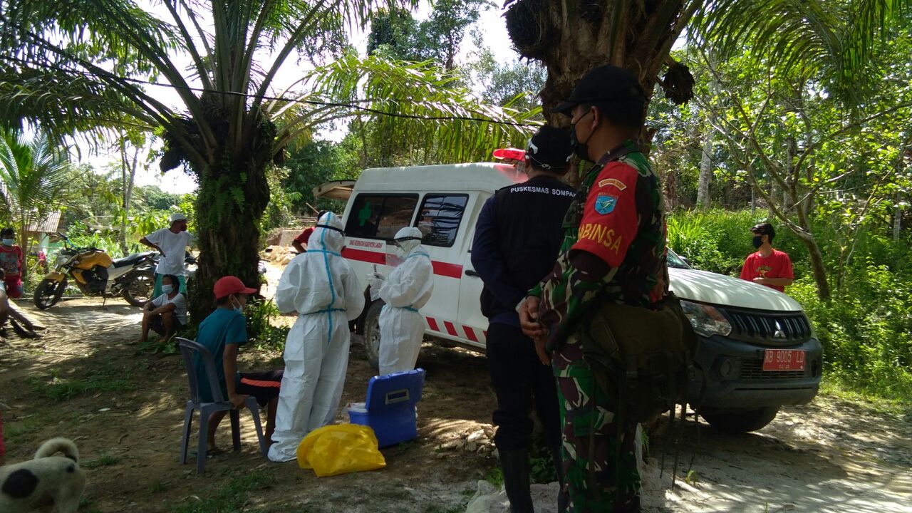 Landak – Babinsa Koramil 1201-07/Mempawah Hulu, Serda Simon mendampingi tenaga kesehatan Puskesmas Sompak melakukan tes swab warga Dusun Pauh Bale, Desa Pakumbang, Kecamatan Sompak, Kabupaten Landak, Selasa (1/6/2021).