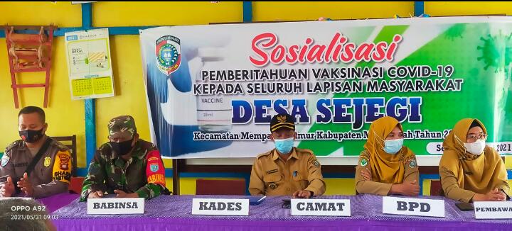 Mempawah – Babinsa 1201-03/Mempawah Hilir, Serma Supriadi mendampingi tim sosialisasi vaksin Covid-19 dari Puskesmas Antibar di Desa Sejegi, Kecamatan Mempawah Timur, Selasa (1/6/2021)