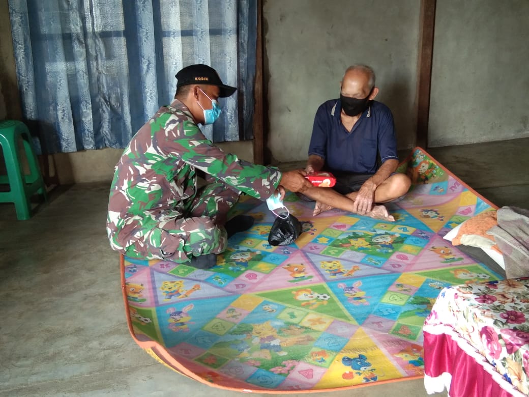 Landak – Komandan Koramil 1201-06/Menjalin Peltu Suparlan bersama Babinsa melaksanakan anjangsana dan memberikan bantuan kepada seorang warga lanjut usia (Lansia) di
