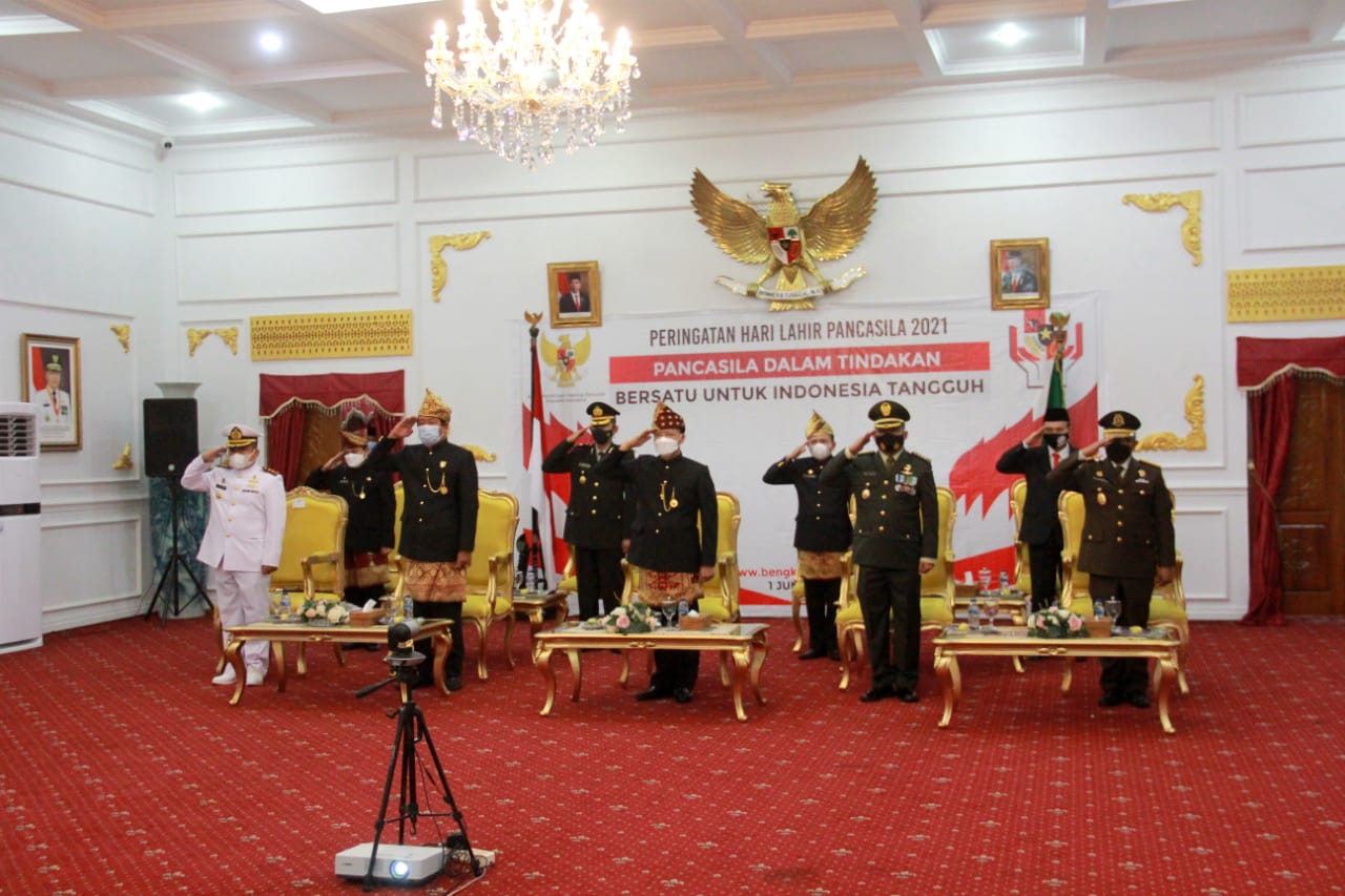 Bengkulu, Siberindo.co – Gubernur Bengkulu Rohidin Mersyah bersama Forum Koordinasi Pimpinan Daerah (FKPD) Provinsi Bengkulu mengikuti Upacara Peringatan Hari Lahir Pancasila, yang dipimpin langsung oleh Presiden Republik Indonesia Joko Widodo, Selasa (1/6/2021) melalui virtual di Balai Raya Semarak Bengkulu.