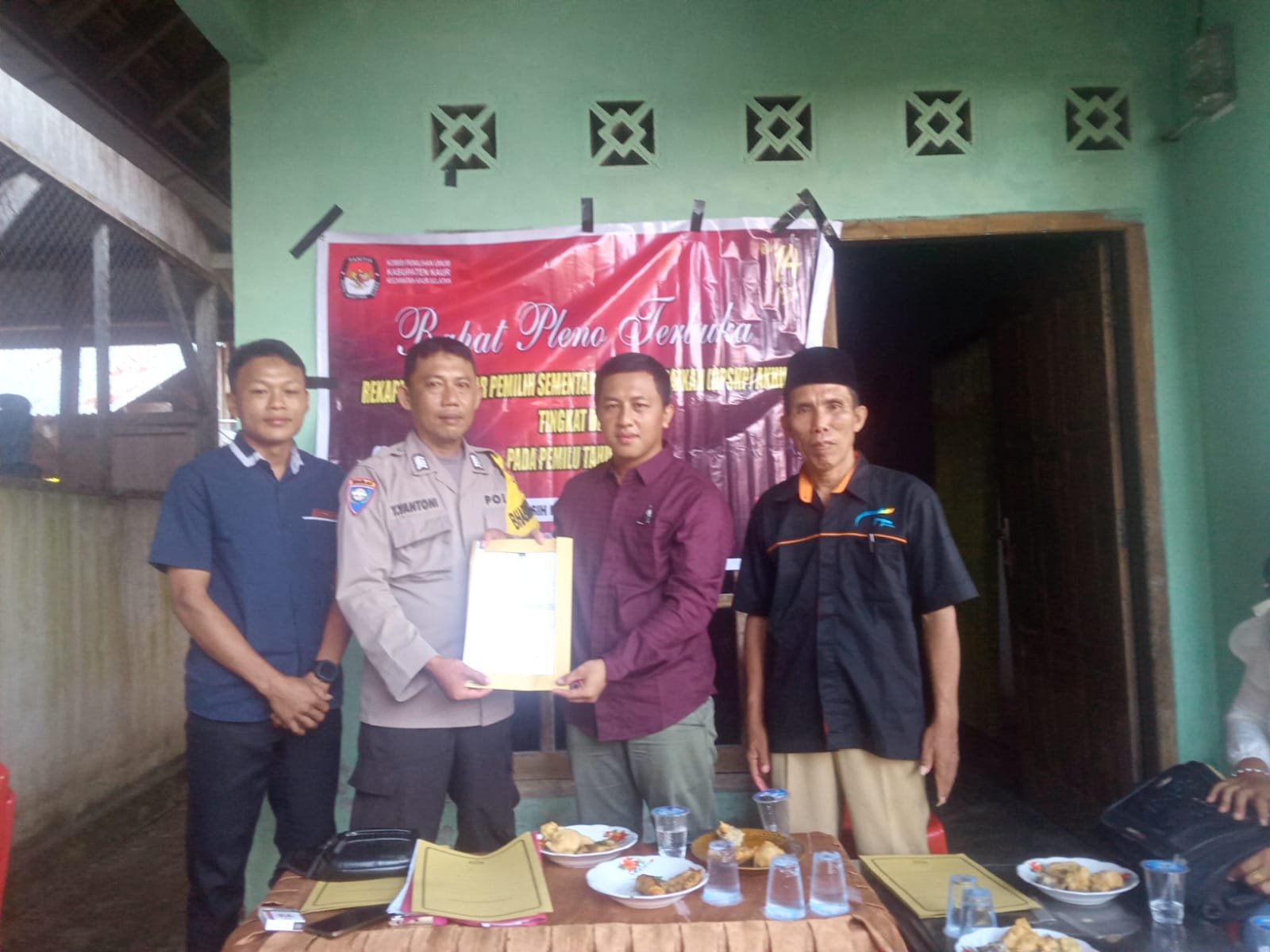 Kaur – Bhabinkamtibmas Polsek Kaur Selatan Polres Kaur Polda Bengkulu Bripka Y Yantoni, hadir dalam rapat pleno terbuka Rekapitulasi Daftar Pemilih Sementara Hasil Perbaikan (DPSHP) akhir, di Desa Selasih Kecamatan Kaur Selatan, Kabupaten Kaur, Kamis (1/6/2023).
