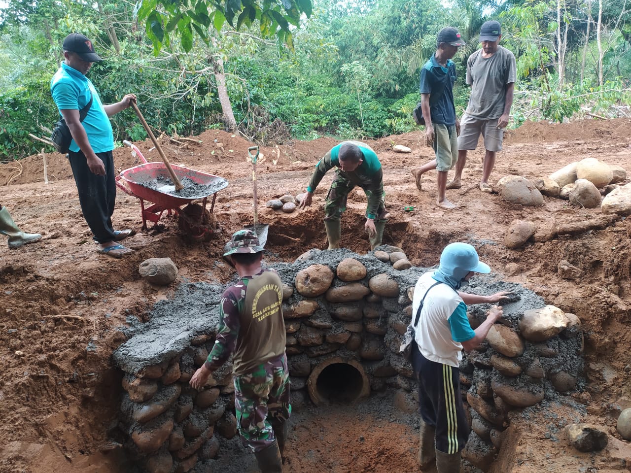 Dalam pembuatan gorong gorong ini berdiameter 40 cm hari ke 8, 02 Agustus 2022. Tim Satgas TMMD besama masyarakat melanjutkan pembuatan pondasi.