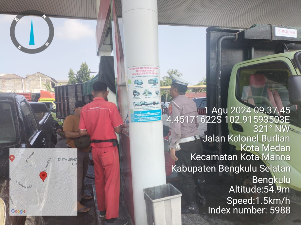 Bengkulu Selatan – Sat Lantas Polres Bengkulu Selatan Polda Bengkulu, melaksanakan giat pengawasan pendistribusian dan pengisian BBM serta pengaturan arus lalulintas dimana dianggap berpotensi terjadinya lakalantas di kabupaten bengkulu selatan terutama pada jam jam sibuk aktifitas masyarakat, pada hari Kamis (01/08/24).