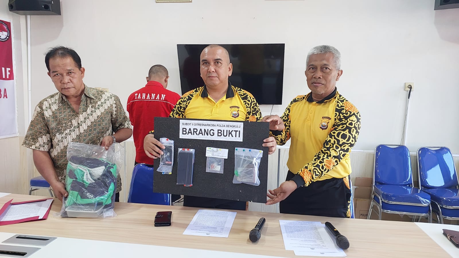 Wadirres Narkoba Polda Bengkulu AKBP Tonny Kurniawan, S.I.K., saat press release di Mapolda Bengkulu, Jumat (1/9/2023) menyampaikan, dalam pengungkapan tersebut, selain menangkap terduga pelaku, pihaknya juga mengamankan barang bukti berupa 2 paket Narkoba jenis Sabu didalam kotak rokok LA Bold, 2 paket Sabu didalam dompet FNP.