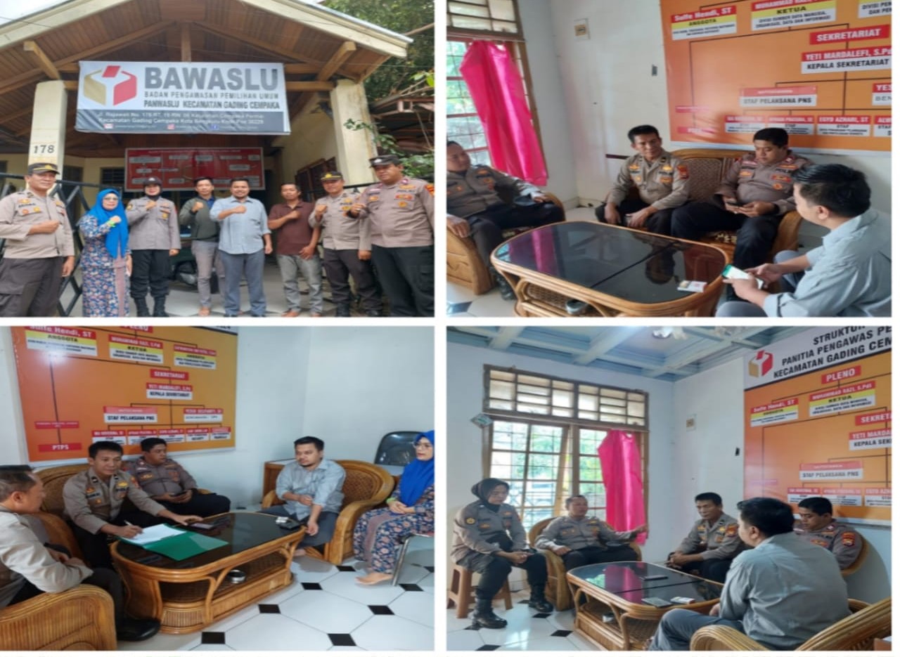 Bengkulu – Satgas Preventif Subsatgas Polsek Gading Cempaka Polresta Bengkulu melakukan koordinasi dan monitoring di kantor Panwascam Kecamatan Gading Cempaka Kota Bengkulu, Sabtu (02/12/2023).