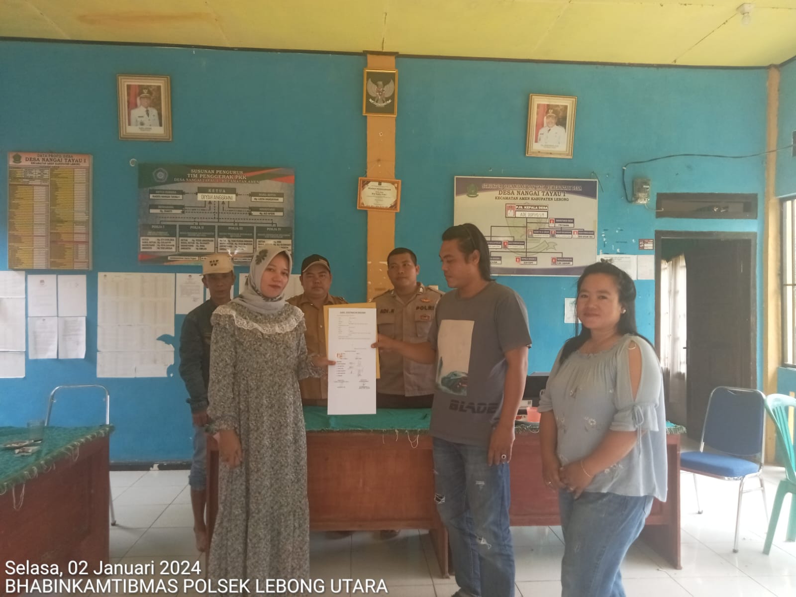 Mediasi dilaksanakan pada Selasa (2/1/2024) di Gedung Pertemuan Desa Nangai Tayau I, dengan dihadiri kedua belah pihak, para saksi, dan Pj Kades Nangai Tayau I.