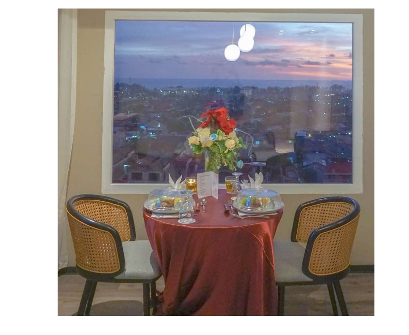 Set menu internasional atau Indonesia terbaik, termasuk makanan pembuka, pilihan hidangan utama yang lezat, sup yang nikmat, dan hidangan penutup yang manis. dengan setangkai bunga mawar serta coklat berbentuk hati yang melengkapi makan malam romantic Anda.