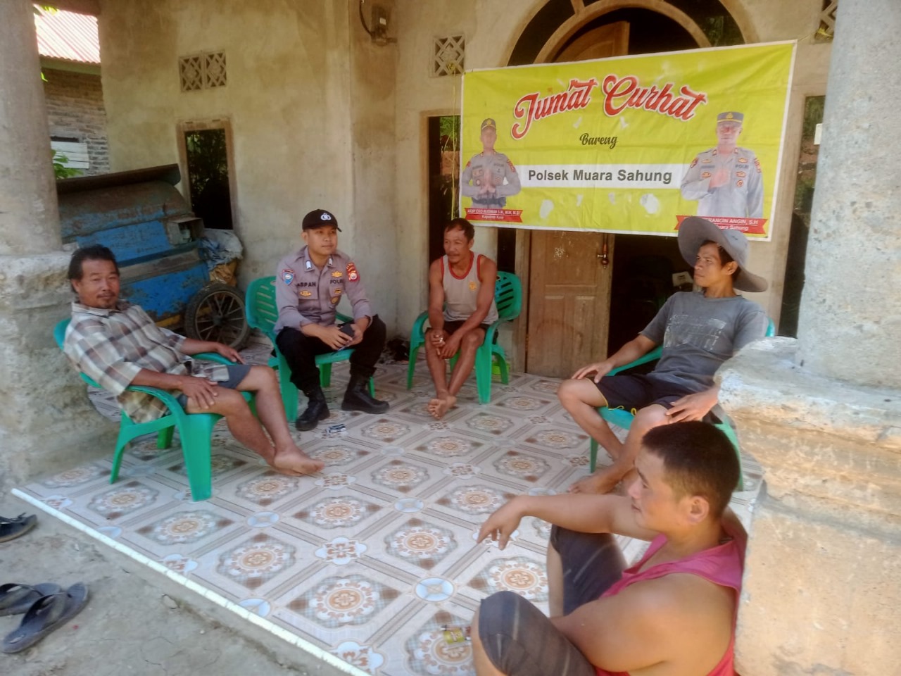 Bhabinkamtibmas Polsek Muara Sahung Bripka Budi Girijati menyampaikan kegiatan Jumat Curhat ini merupakan wadah untuk menampung aspirasi dengan Tokoh masyarakat, Kades dan perangkat guna menerima keluhan dari masyarakat Desa Muara Sahung.