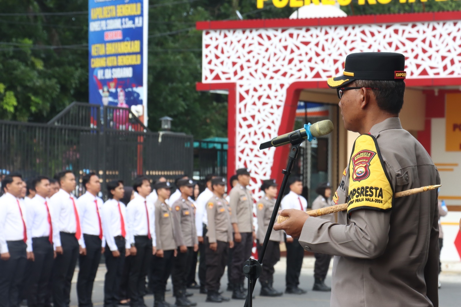 Bengkulu – Kapolresta Bengkulu Kombes Pol Sudarno, S.Sos., M.H memimpin pelaksanaan apel pagi di Lapangan Apel Mapolresta Bengkulu, Senin (03/02).