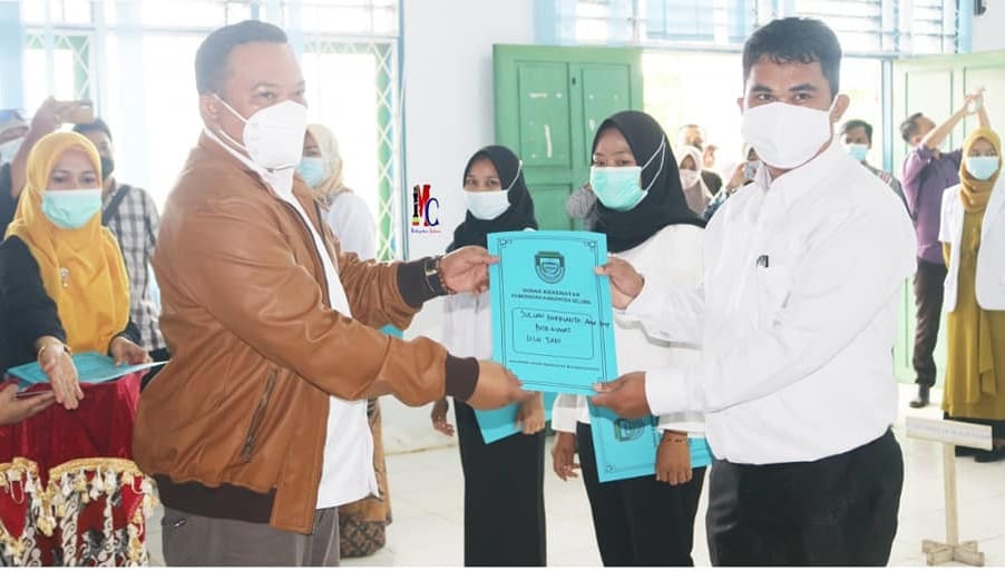 Bengkulu, Siberindo.co – Bupati Seluma Erwin Octavian, S.E, didampingi Wakil Bupati Seluma Drs. Gustianto menyerahkan SK PTT di Lingkungan Dinas Kesehatan Kabupaten Seluma, Jum’at (2/4/2021) di Aula Dinas Kesehatan Seluma.