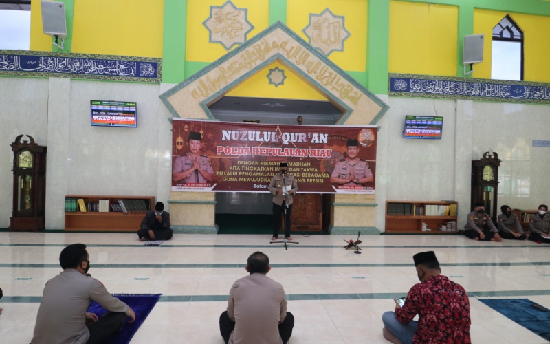 Peringatan Nuzulul Quran di Masjid Al- Halim Polda Kepri mengangkat tema ″Dengan Hikmah Ramadhan Kita Tingkatkan Iman dan Takwa Melalui Pengalaman Moderasi Beragama Guna Mewujudkan Polri Yang Presisi″, Jumat (30/4/2021).
