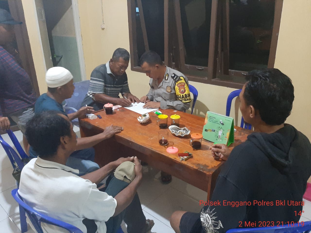 Bengkulu Utara—Selaku Bhabinkamtibmas Didesa Binaanya Aipda M.Harahap Didampingi oleh kanit Reskrim Aiptu Simitomo dan Kanit Intelkam Aipda Bambang Riyadi menghadiri musyawarah penyelesaian masalah tingkat Desa tentang sengketa Penebangan Kayu Antara Saudara Sucipti , Umur 49 Tahun Pekerjaan Petani Alamat Dusun 3 Desa Meok Kec.Enggano Dengan Saudara Samuji Umur 51 Thn Pekerjaan Petani, Alamat Dusun 3 Desa Meok Kecamatan Enggano di Mapolsek Enggano (02/05/2023).