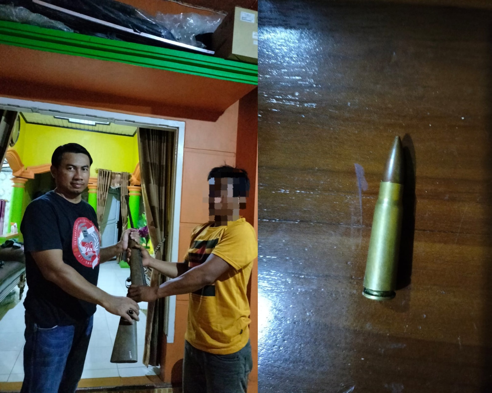 “Senpi rakitan jenis laras panjang yang diserahkan warga ini berkaliber 5.56 dengan 1 butir peluru,” kata Kapolsek Maje.