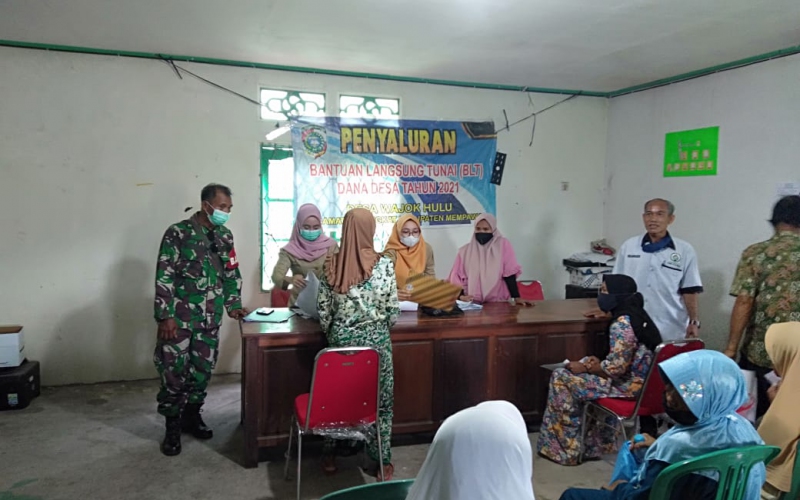 Babinsa Koramil 1201-01/Jungkat, Jajaran Kodim 1201/Mempawah, Sertu Suyatno mendampingi penyaluran Bantuan Langsung Tunai Dana Desa (BLT-DD) kepada 364 warga Desa Wajok Hulu, Kecamatan, Jungkat, Kabupaten Mempawah, Senin (31/5/2021).