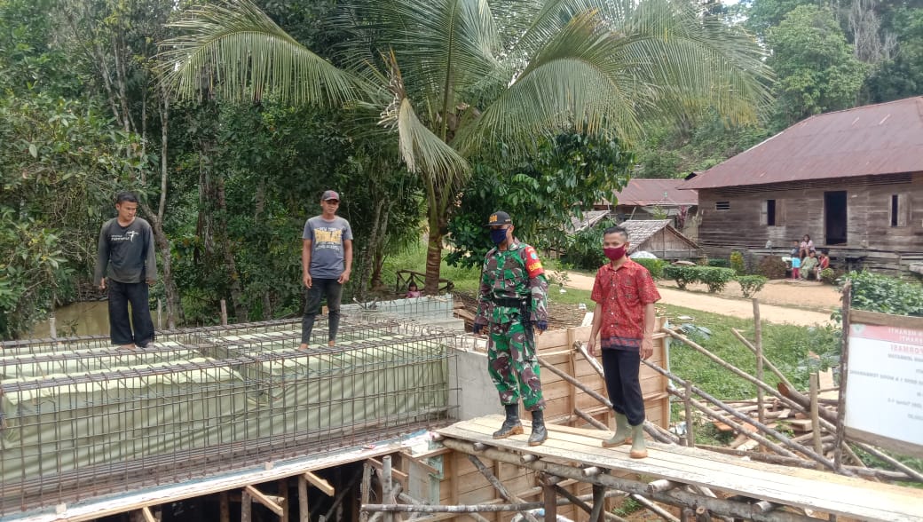 Landak – Babinsa Koramil 1201-10/Menyuke, Sertu Yanantoneli memantau perkembangan pembangunan jembatan beton yang menghubungkan ruas jalan antara Desa Meranti dan Desa Selange, Kecamatan Meranti, Kabupaten Landak, Rabu (2/6/2021)