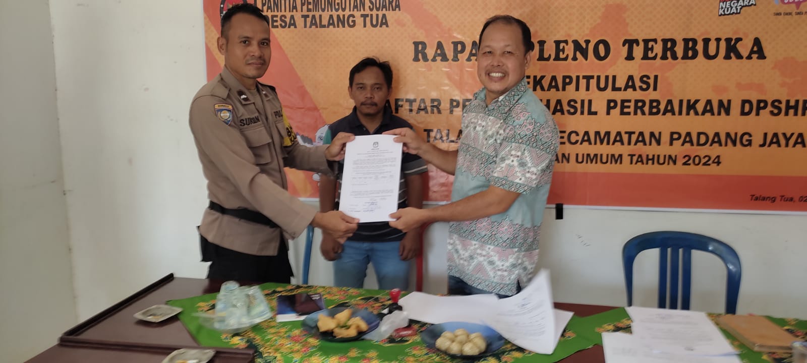 Rapat pleno dilaksanakan di Aula Kantor Desa Talang Tua Kec. Padang Jaya Kab. Bengkulu Utara dan dihadiri Ketua PPS, Ketua Bawaslu Kec. Pdg Jaya, Panwaslu Ds. Talang Tua, Anggota PPS, dan Bhabinkamtibmas.
