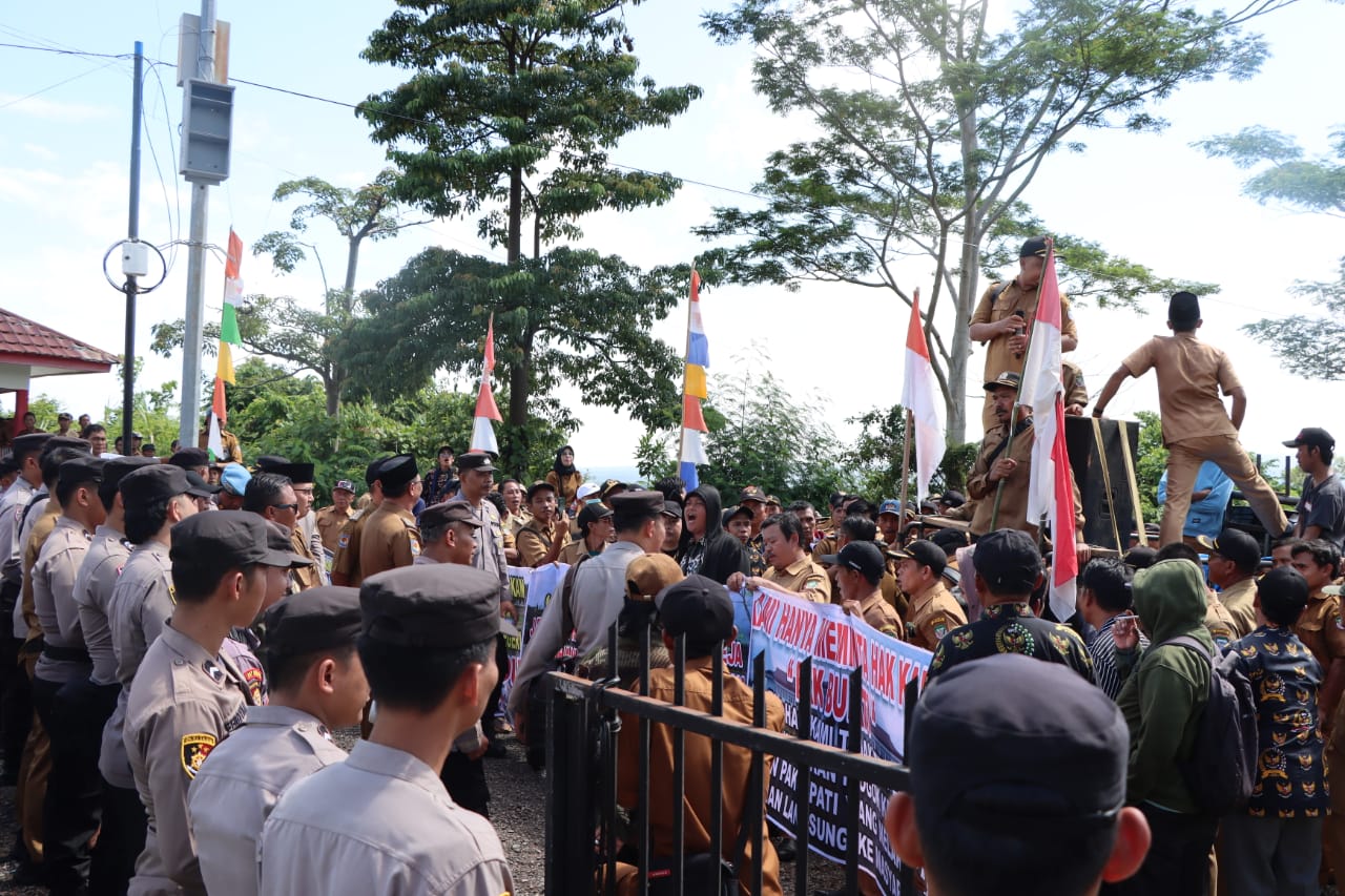 Bupati Seluma didampingi Kapolres Seluma dan PJ Sekda Kab. Seluma menemui massa aksi dan menerima tuntutan aksi damai tersebut dengan perwakilan massa aksi melaksanakan hearing dipimpin oleh Bupati Seluma yang dihadiri oleh :