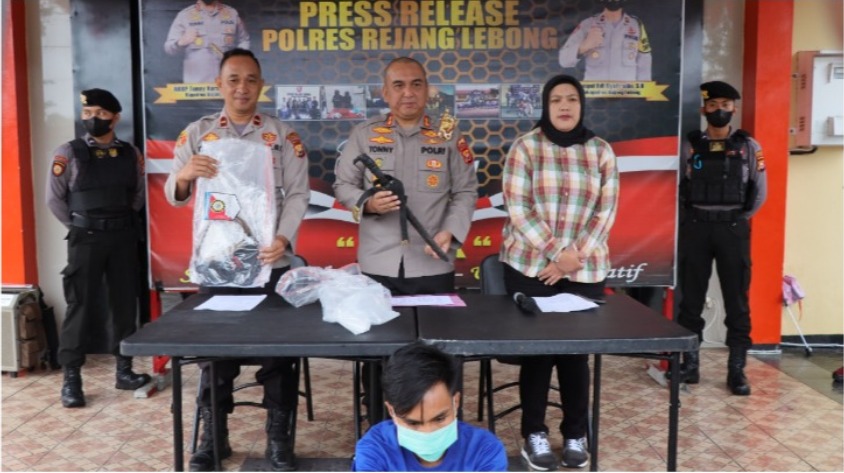 Kapolres Rejang Lebong Polda Bengkulu AKBP Tonny Kurniawan didampingi Kapolsek Bermani Ulu Ipda Sina Alfarobi dan Kasi Humas Iptu Bertha saat menggelar Press Release di Mapolres Rejang Lebong mengatakan, terduga pelaku RH saat ini telah diamankan dan dijerat dengan pasal 2 ayat 1 UU Darurat Tahun 1951 lantaran menguasai senjata tajam yang bukan pada tempat dan profesinya.
