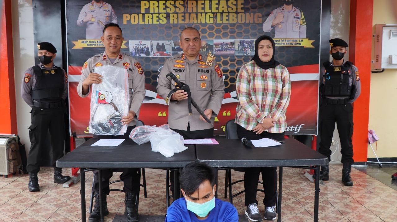 Kapolres Rejang Lebong Polda Bengkulu AKBP Tonny Kurniawan didampingi Kapolsek Bermani Ulu Ipda Sina Alfarobi dan Kasi Humas Iptu Bertha saat menggelar Press Release di Mapolres Rejang Lebong mengatakan, terduga pelaku RH saat ini telah diamankan dan dijerat dengan pasal 2 ayat 1 UU Darurat Tahun 1951 lantaran menguasai senjata tajam yang bukan pada tempat dan profesinya.