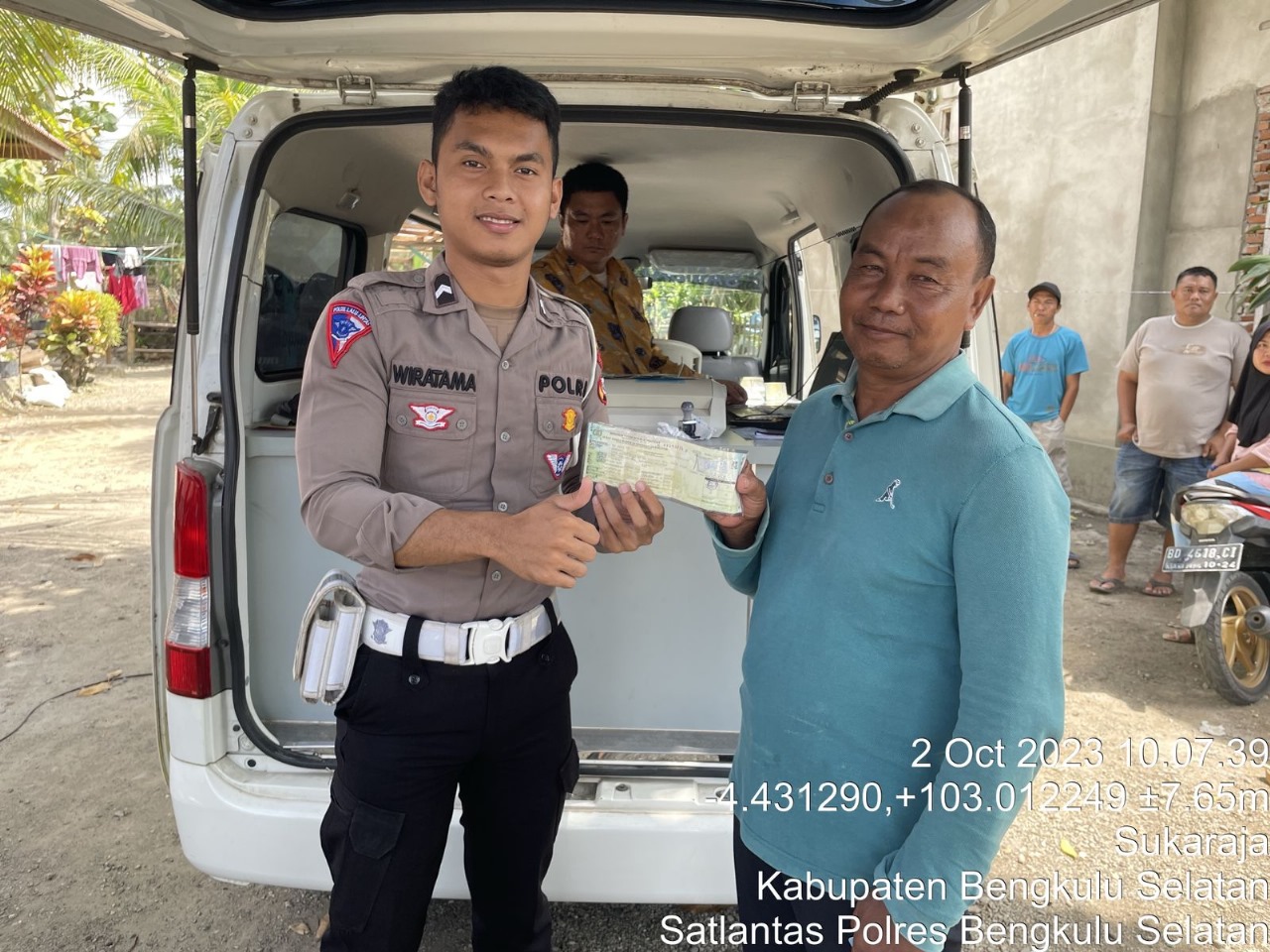 Bengkulu Selatan – Personel Polres Bengkulu Selatan Polda Bengkulu, Bripda Wiratama Luke.F, bersama petugas Jasa Raharja dan UPTD Samsat lainya melaksanakan pelayanan Samsat keliling di wilayah Kecamatan Kecamatan Seginim dan Air Nipis Kabupaten Bengkulu Selatan, Senin (01/10/23).