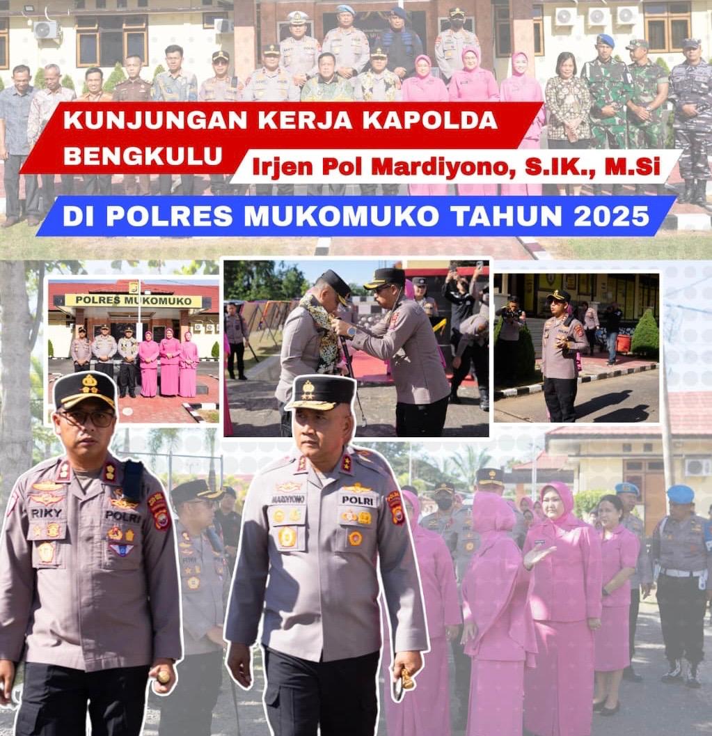 Mukomuko, 30 Oktober – 1 November 2025 — Kapolda Bengkulu Irjen Pol Mardiyono, S.I.K., M.Si. bersama Ketua Bhayangkari Daerah Bengkulu Ny. Yanti Mardiyono, didampingi Wakapolda Bengkulu Brigjen Pol Dicky Sondani, S.I.K., M.H. serta Pejabat Utama Polda Bengkulu, melaksanakan kunjungan kerja ke Polres Mukomuko.