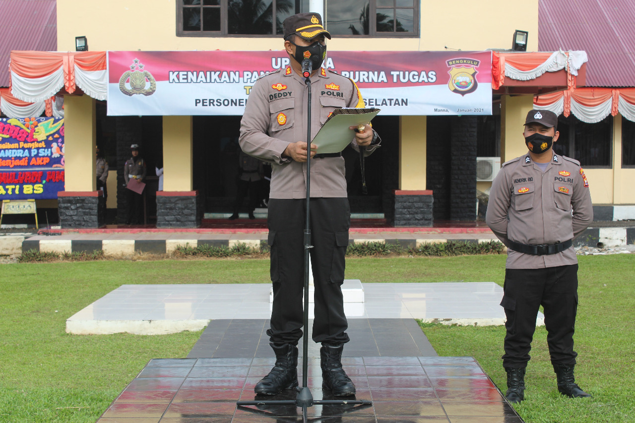 Dalam amanatnya Kapolres Bengkulu Selatan berpesan kepada anggota yang telah dinaikkan pangkat satu tingkat lebih tinggi untuk tetap menjaga kebersamaan dan kekompakan dalam internal Polri. Tak hanya itu bertepatan dengan tahun baru 2021 ia juga mengajak seluruh anggota untuk melakukan evaluasi diri kinerja satu tahun sebelumnya.