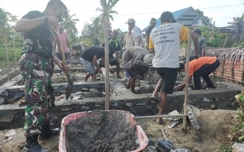 “Salah satu anak dari bapak Colleng kemudian menghibahkan tanahnya untuk dijadikan pembangunan rumah tersebut. Dan sekarang proses pembangunan rumah sedang berjalan secara gotong royong dengan warga desa setempat bersama anggota Koramil 1412-05 Pakue,” kata Kapten Inf. Rustam. Kebersamaan masyarakat dengan para Babinsa menunjukkan semangat kepedulian yang luar biasa. Inilah wujud kemanunggalan TNI bersama rakyat yang tidak pernah pudar oleh waktu dan terpaan modernisasi.