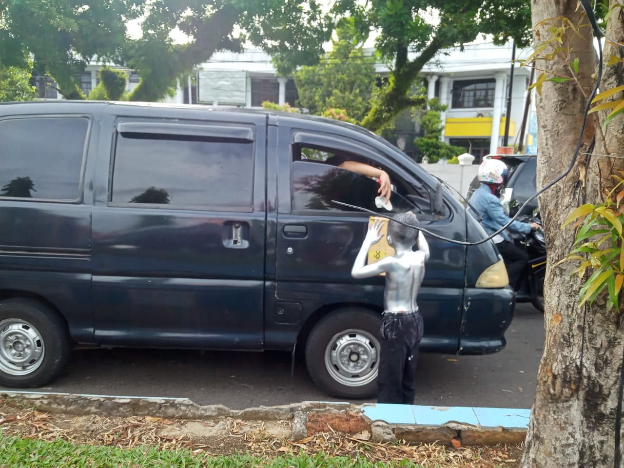 Sebut saja Apip (8). Apip harus rela tubuhnya diguyur warna silver demi mendapatkan rupiah dari para pengendara di simpang lampu merah. Apip sering mangkal di simpang lampu merah Padang Harapan.