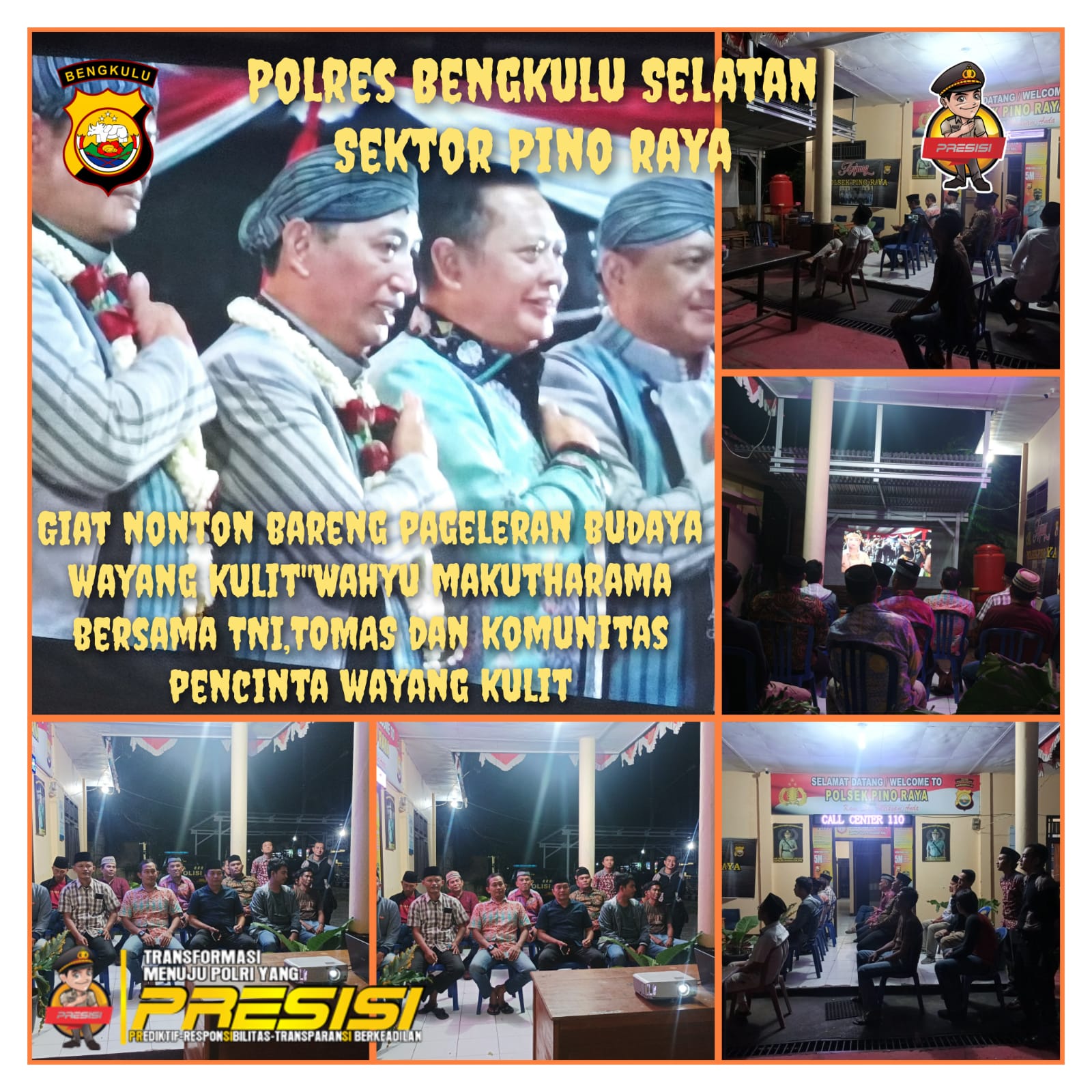 Bengkulu Selatan, Bengkulusiberindo.co – Polsek Pino Raya Polres Bengkulu Selatan Polda Bengkulu bersama Danramil, tokoh masyarakat, undangan lintas instansi, dan komunitas seni, menggelar nonton bareng (Nobar) secara virtual gelaran wayang kulit lakon “Wahyu Makutharama”, Jumat (03/2/2023) malam. Kegiatan nonton bareng virtual ini digelar di Mako Polsek Pino Raya.