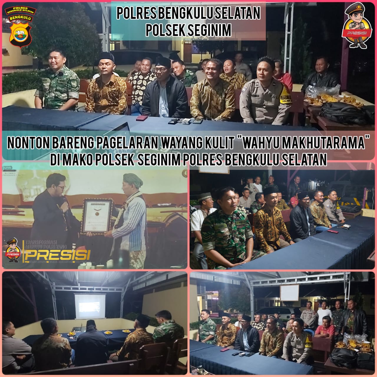 Bengkulu Selatan, Bengkulusiberindo.co – Polsek Seginim Polres Bengkulu Selatan Polda Bengkulu bersama unsur TNI, tokoh masyarakat, undangan lintas instansi, dan komunitas seni, menggelar nonton bareng (Nobar) secara virtual gelaran wayang kulit lakon “Wahyu Makutharama”, Jumat (03/2/2023) malam. Kegiatan nonton bareng virtual ini digelar di Mako Polsek Seginim.
