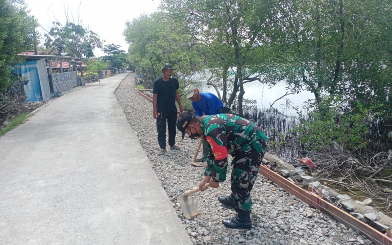 Anggota Koramil 0406/Cikampek Kodim 0604/Karawang monitoring dibantu 7 orang masyarakat mengerjakan pembangunan peningkatan dan pelebaran badan jalan 3 dalam kegiatan TNI Manunggal Membangun Desa (TMMD) ke-110 Kodim 0604/Karawang Tahun Anggaran 2021.