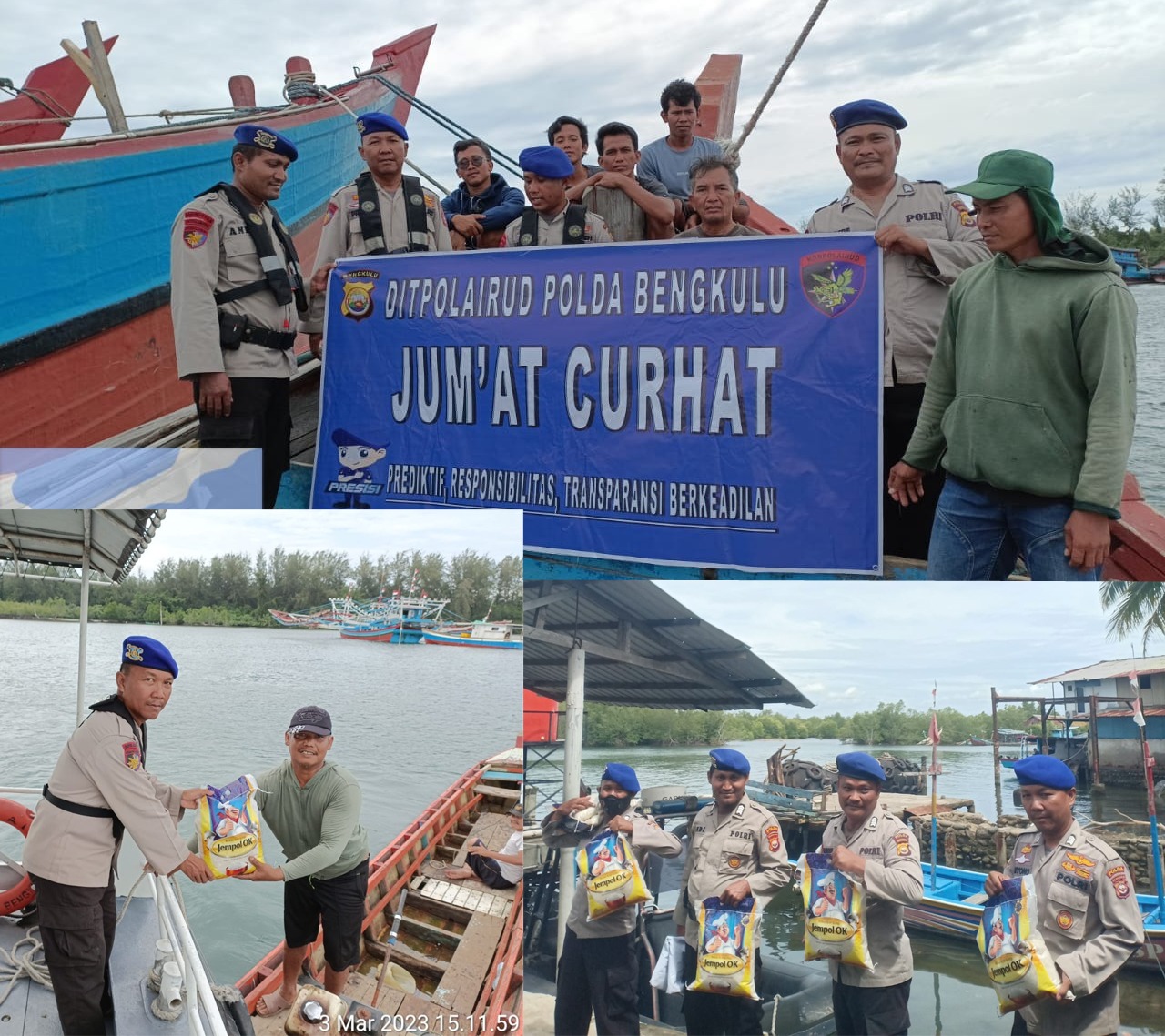 Bengkulu, Siberindo.co – Ditpolairud Polda Bengkulu menggelar Jumat Curhat terunik yang pernah ada saat ini, yakni personel dengan menggunakan kapal, membagikan beras kepada nelayan kecil, Jumat (3/3/2023) siang.