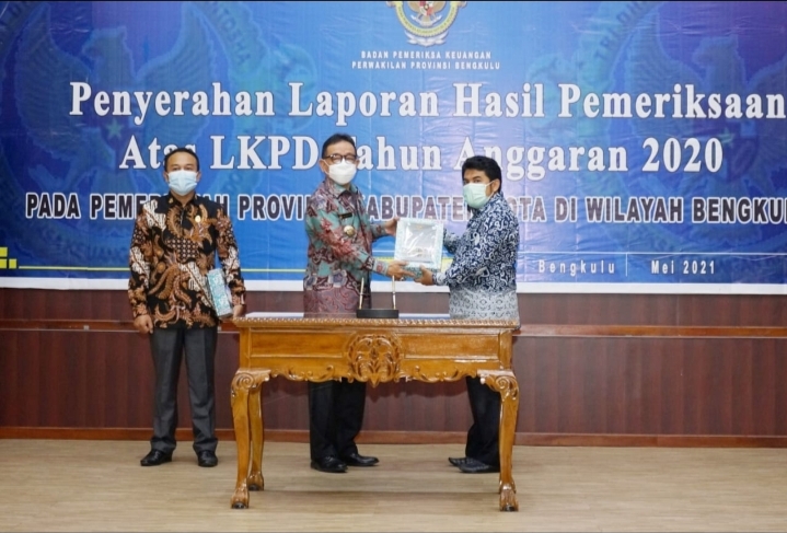 Bengkulu, Siberindo.co – Pemerintah Kabupaten Kepahiang dibawah kepemimpinan Bupati Hidayattullah Sjahid kembali meraih predikat Opini Wajar Tanpa Pengecualian (WTP) dari BPK-RI Perwakilan Provinsi Bengkulu. Penyerahan laporan hasil pemeriksaan (LHP) atas laporan keuangan pemerintah daerah (LKPD) kabupaten Kepahiang tahun anggaran 2020 dilaksanakan di Aula Kantor BPK-RI Bengkulu dan diserahkan langsung oleh Plh. Kepala BPK-RI Perwakilan Provinsi Bengkulu Muhammad Hidayat, Selasa (4/5/2021) pukul 11.00 Wib.