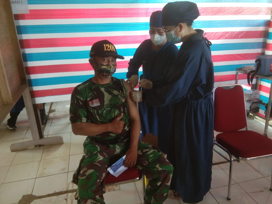 Landak – Babinsa Koramil-1201-10/Menyuke menerima vaksin Sinovak pertama di Puskesmas Darit, Kecamatan Menyuke, Kabupaten Landak, selasa (25/5/2021).
