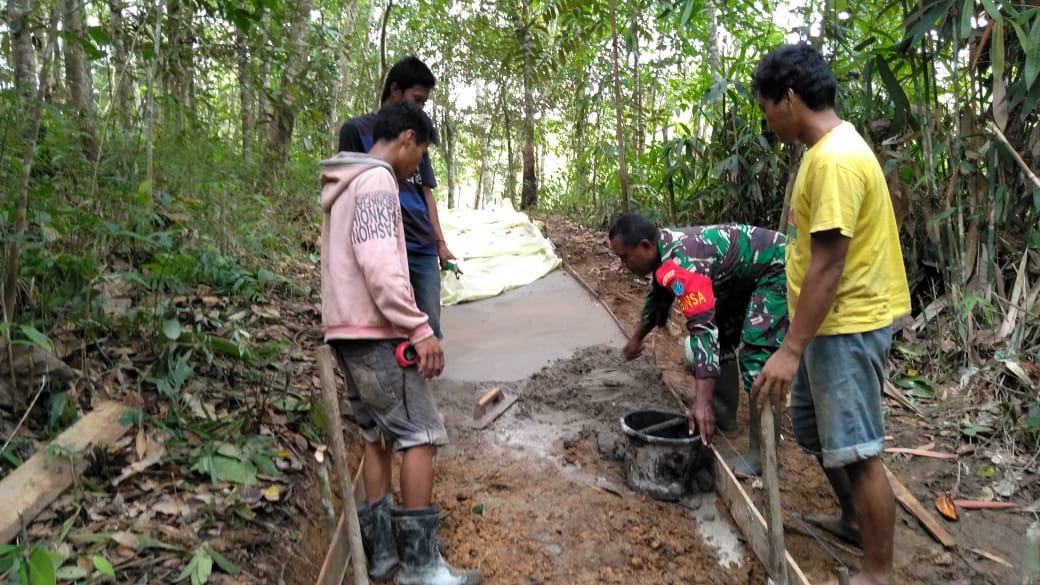 Landak-Koramil 1201-12/Air Besar bersama warga bergotong royong membangun jalan rabat beton di Desa Sekendal, Kecamatan Air Besar,Kabupaten Landak, Rabu(26/5/2021).Kerja bakti ini dilakukan sebagai upaya pembangunan infrastruktur jalan untuk membantu masyarakat dalam beraktivitas.