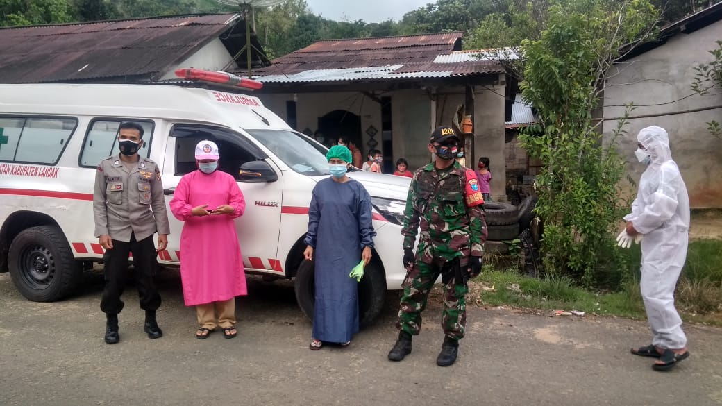 Landak – Babinsa Koramil 1201-07/Mempawah Hulu, Serda Saipul Dampingi tenaga kesehatan dari Puskesmas Karangan melakukan tes swab terhadap warga Desa Caokng, Kecamatan Mempawah Hulu, Kabupaten Landak, Sabtu (29/5/2021).