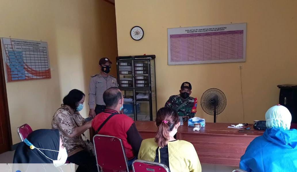 Mempawah – Babinsa Koramil 1201-05/Toho, Kodim 1201/Mempawah, Kopda Sugiono bersama Bhabinkamtibmas dan Tim PPKM melaksanakan tracing kepada warga yang berkontak erat dengan salah seorang pasien yang terpapar Covid-19 di Desa Sambora Kecamatan Toho, Kabupaten Mempawah. jum’at(28/5/2021).