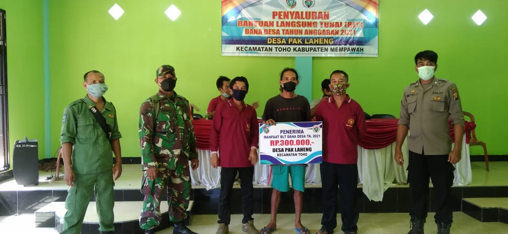 Mempawah – Babinsa Koramil 1201-05/Toho, Kodim 1201/Mempawah, Serda Sardi Kusuma mengawal penyaluran Bantuan Langsung Tunai Dana Desa (BLT-DD) ke warga yang kurang mampu di Desa Pak Laheng, Kecamatan Toho, Kabupaten Mempawah, Rabu (26/5/2021).